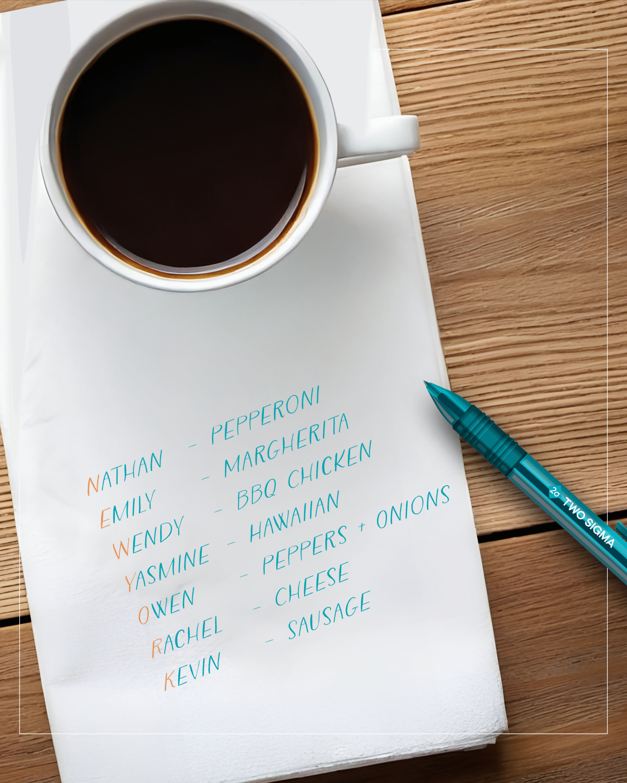 Rachel is ordering pizza for seven people. She had written down who ordered what but accidentally spilled coffee on her list. Here’s what’s still legible:
