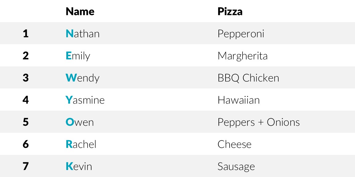 Nathan, Yasmine, and Wendy still need pizzas. The remaining options are Pepperoni (#1), BBQ Chicken (#3), and Hawaiian (#4). Nathan likes “the classics” and would only order Cheese, Pepperoni, or Margherita. Cheese and Margherita are taken, so Nathan has Pepperoni (#1). Wendy doesn’t believe pineapple belongs on pizza, ruling out Hawaiian. That means Wendy has BBQ Chicken (#3) and Yasmine has Hawaiian (#4).