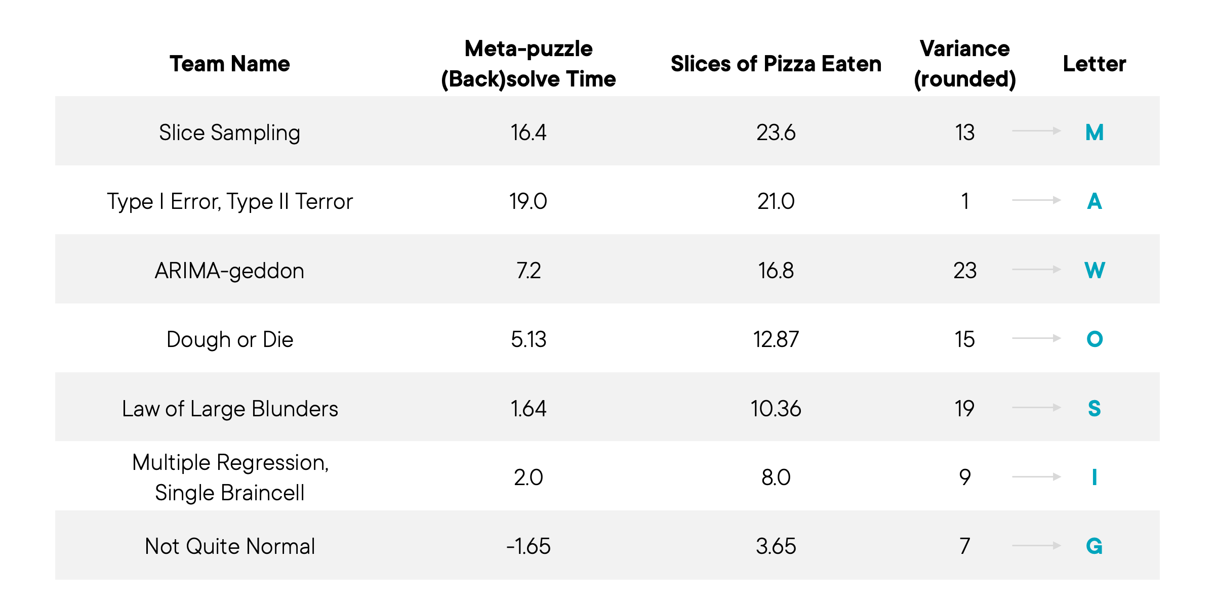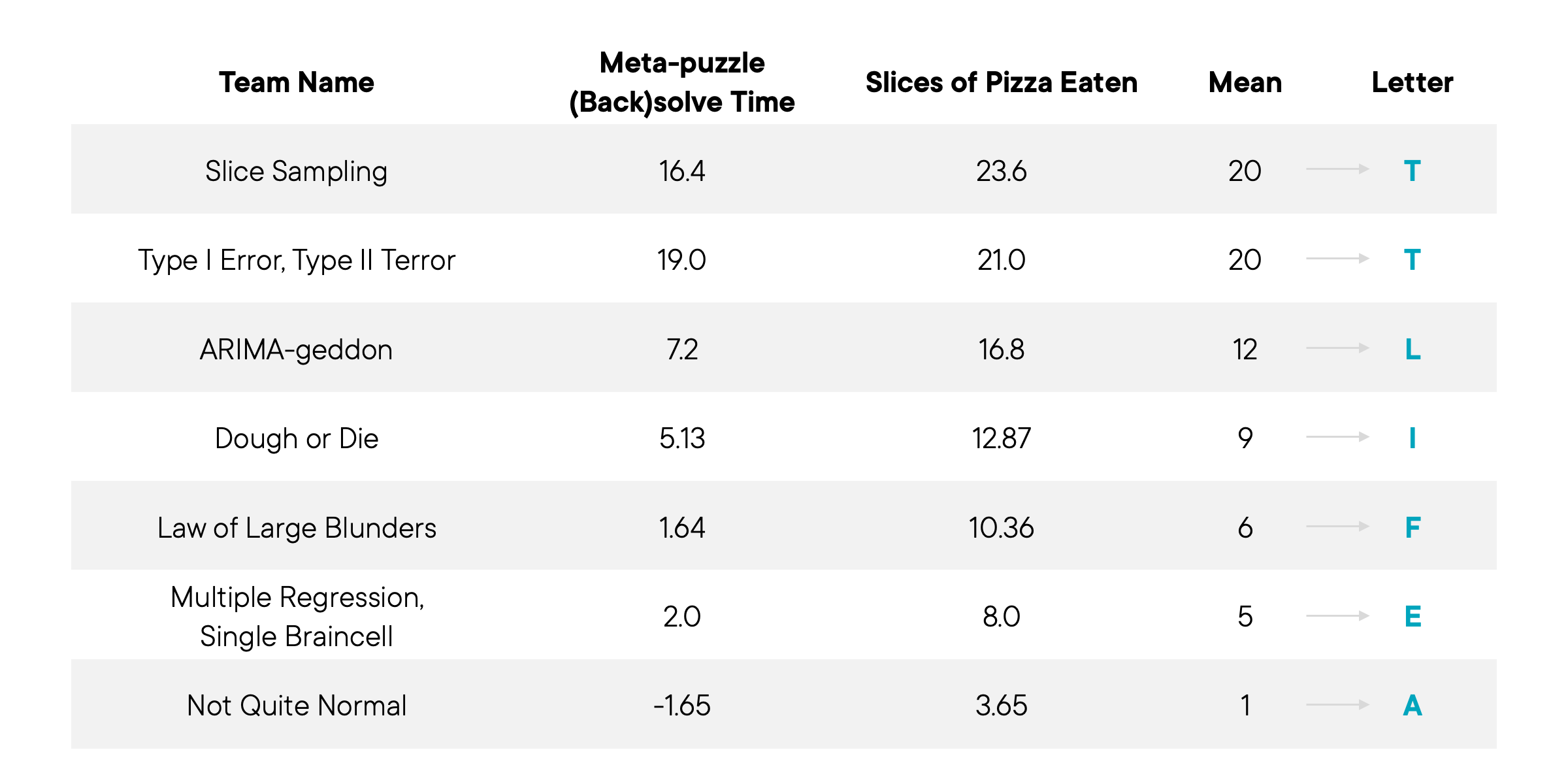 To find the first moment (mean) we averaged the two columns for each team and then turned each mean into a letter where A=1, B=2, C=3, and so on. This gave us: T, T, L, I, F, E, A