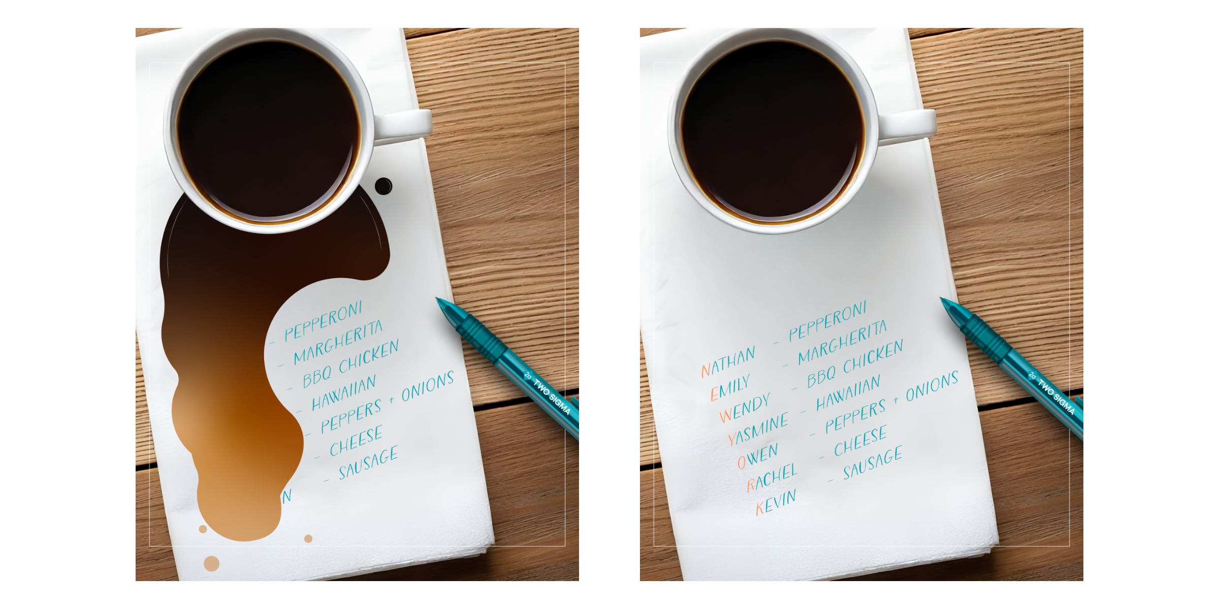 Rachel is ordering pizza for seven people. She had written down who ordered what but accidentally spilled coffee on her list. She can’t remember exactly what everyone ordered, but she thinks she can piece it together based on what she recalls about everyone’s preferences.