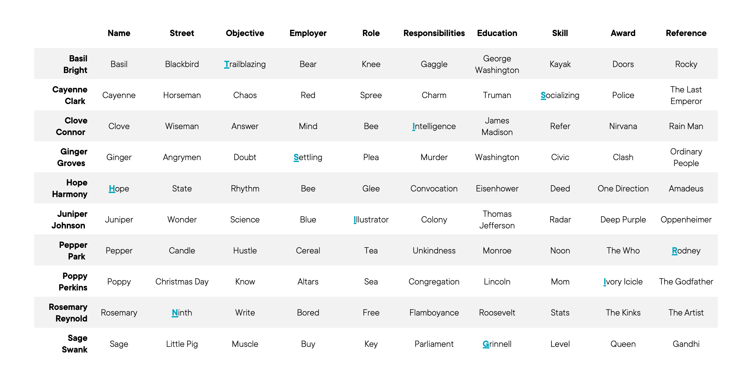 For each category, nine of the ten resumes correctly fulfil it, and one resume is an outlier. Each resume has an outlier in one and only one category. If you look at the first letter of each exception word (highlighted below), you’ll see H, N, T, S, I, I, G, S, I, R which rearranges to TS IS HIRING!