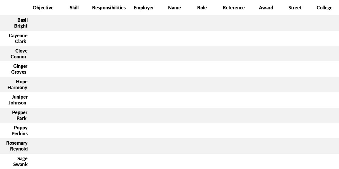 Each of the 10 resumes has 10 categories with information relevant to this puzzle. You can create a matrix like this: